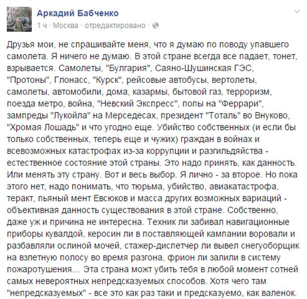 Ну какой теперь смысл докапываться до того же Бабченки, бить его... За что? За то, что гибель двух с лишним сотен наших соотечественников он использовал для своего подлого политического антигосударственного пиара? За то, что сплясал вот так незатейливо на свежих русских костях?